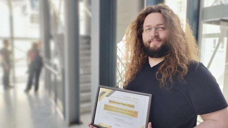 Nils Morawietz, Mitarbeiter an der Professur Algorithm Engineering, erhielt auf dem Symposium on Algorithmic Foundations of Dynamic Networks (SAND 2024) einen Best Student Paper Award. Der Preis wurde für die zusammen mit Thomas Erlebach (Durham University) und Petra Wolf (Université de Bordeaux) erstellte Arbeit „Parameterized Algorithms for Multi-Label Periodic Temporal Graph Realization” vergeben.